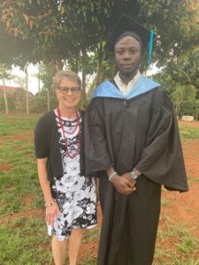 One of the recent examples is a major milestone for Musembe school and the surrounding community. Daniel Mukinisu was the first boy from Musembe primary school ever to go to high school, receiving one of the first scholarships to high school in 2014 from Marafiki’s scholarship program. Not only did Daniel successfully complete high school, but he also qualified for direct entry to college and was the first boy from Musembe to go to college and successfully finish! With the assistance of the community and Marafiki supporters, Daniel successfully graduated from Kisii University in December 2022 with a degree in secondary English teaching. When I asked him why he wanted to be a teacher, he said that he had several teachers along the way who had been inspirations and role models for him. That answer sure blessed this professor’s heart! The Musembe teachers describe Daniel as a young man of humility and discipline and they are so right! I was blessed to be able to travel to Kenya in early December to celebrate Daniel’s achievement with the Musembe community. It was a day-long celebration complete with speeches, encouragement to Daniel, cake, lunch, and plenty of visiting. As I said to the group who had gathered, we all had a part in Daniel’s success, and we will continue to help others along the way. Daniel is now a role model for other students within the Musembe community.